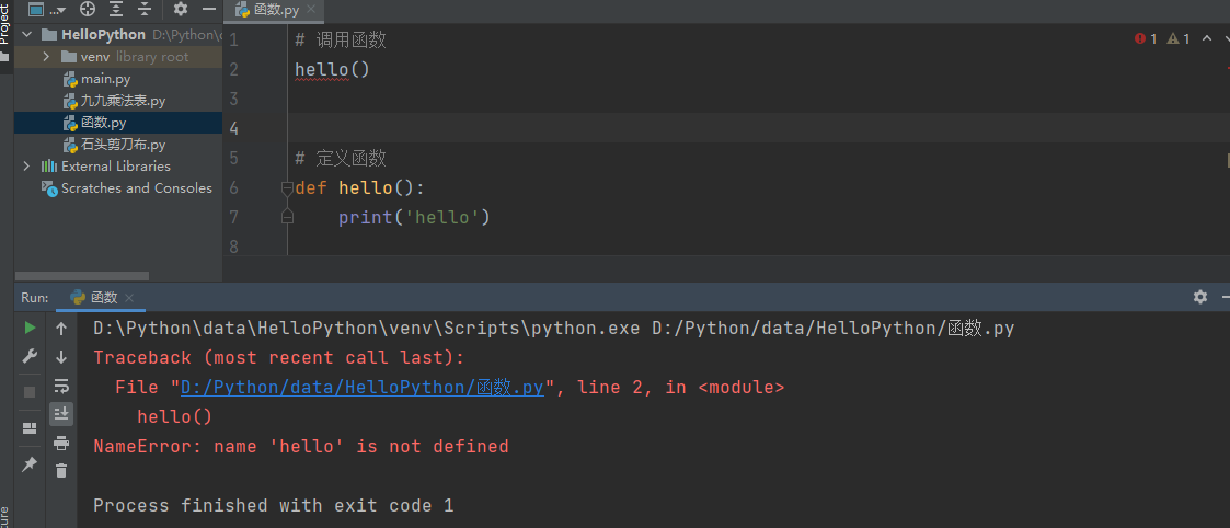 需要注意的是, 在有些语言中, 函数的调用可以发生在函数的定义之前, 而Python中, 函数的调用只能在函数的蒂尼之后, 如果在函数定义前就调用函数, Python会找不到函数, 从而报错
