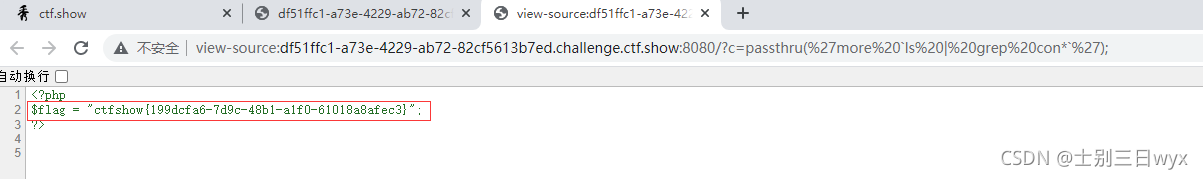 上面的命令 `ls | grep conf*` 返回结果是一个内容为 config.php 的字符串变量, 我们将返回结果作为文件名使用 more命令查看文件内容, 即可获取 flag