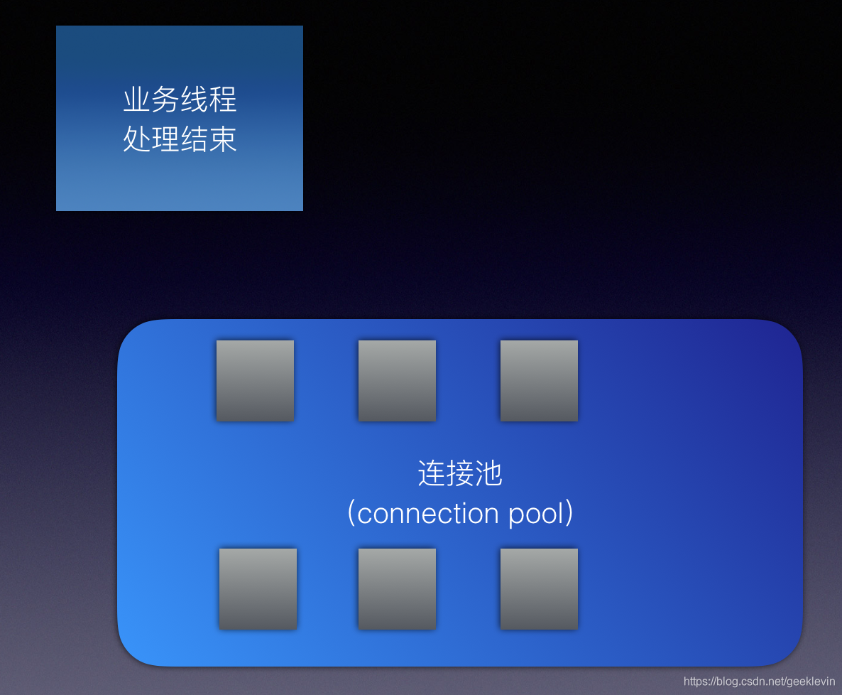 上图所示,当业务线程处理数据时,使用连接;右边为业务处理结束,释放连接,放回连接池中。