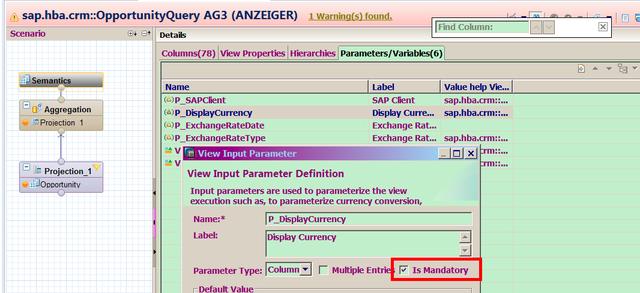 这些必填参数同样是在HANA Studio里建模的,比如UI上看到的参数 Display Currency,对应HANA Studio里的参数P_DisplayCurrency: