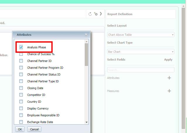 必填参数维护完毕后,给report指定需要显示在UI上的attribute。这里我选择了:“Analysis Phase”.