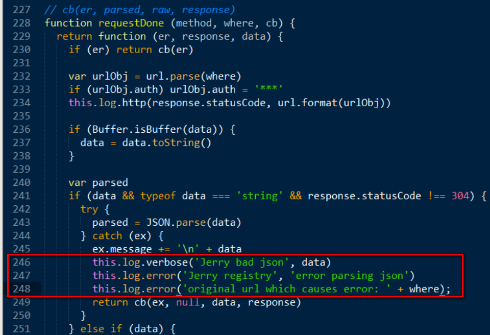 首先根据错误消息判断出这是npm在解析一个json响应时出错,因为这个期望的json响应第一个字符为<.