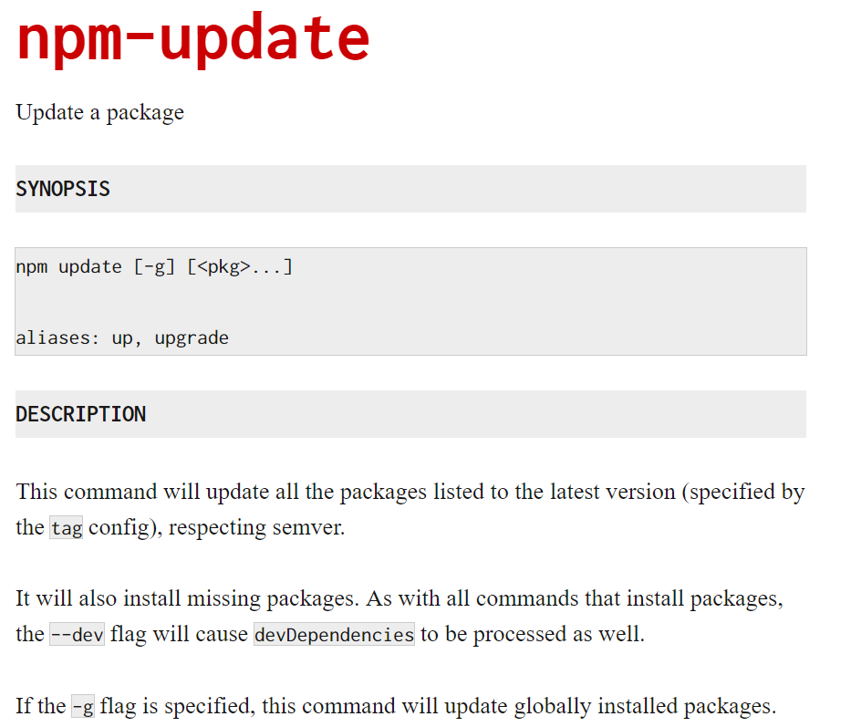 我们需要查看命令npm update的帮助文档。