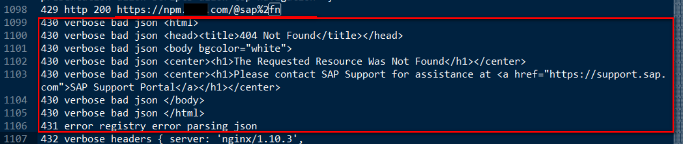 发现是请求依赖包sap/n的包描述json文件时出的错: