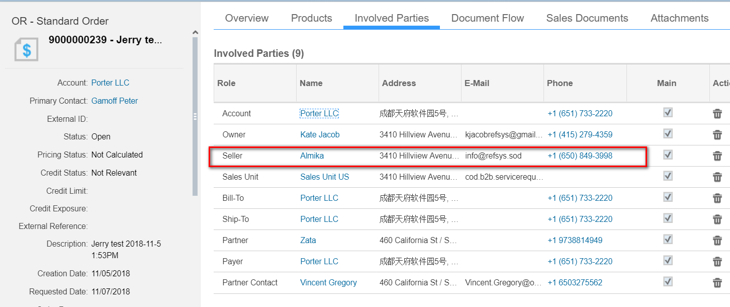 创建成功后,观察这个Sales Order的Involved Party里,Bill to还是Account Porter LLC本身,但是Seller却变成了Almika。为什么这两个party role有区别?