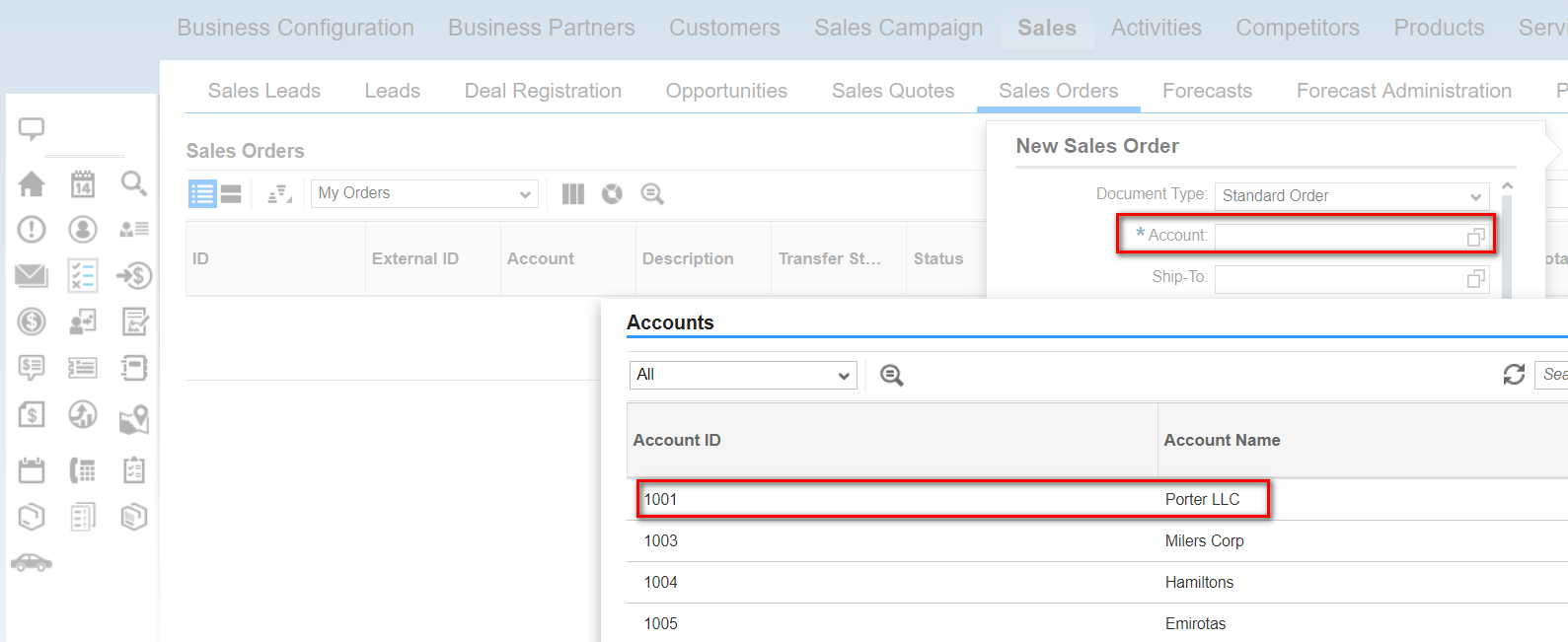 例子:我新建一个Sales Order,account 字段选择ID为1001的Account:Porter LLC