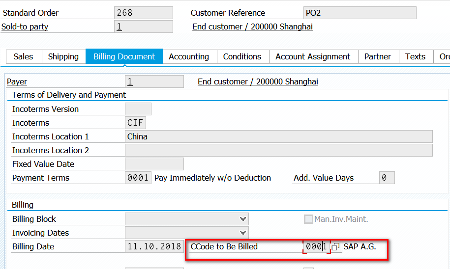 原因:事务码VA03,打开一个已有的Sales Order,Goto->Header->Billing, 查看Company code: