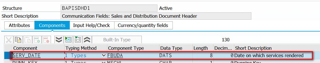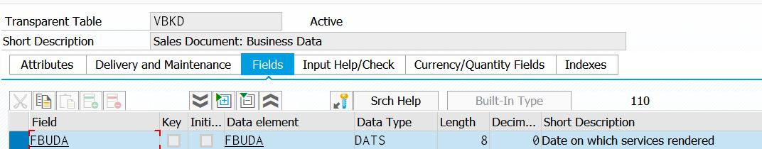 如果想知道一个Sales Order的SERV_DATE字段存储在哪张表,该怎么找呢?注意上图提示,SERV_DATE的类型是FBUDA. 记住这个FBUDA名称。