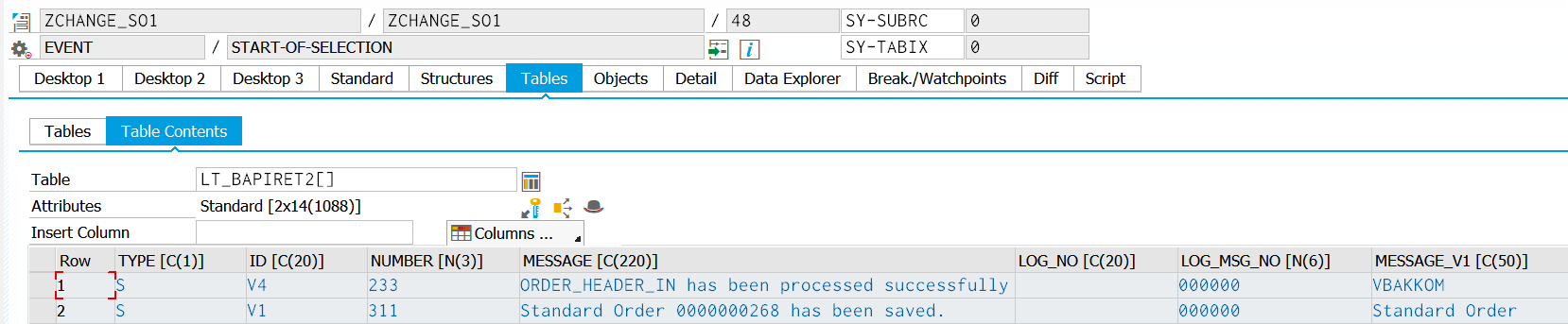 执行之后,从输出参数lt_bapiret2里查看到这个Sales Order已经成功被更新了。