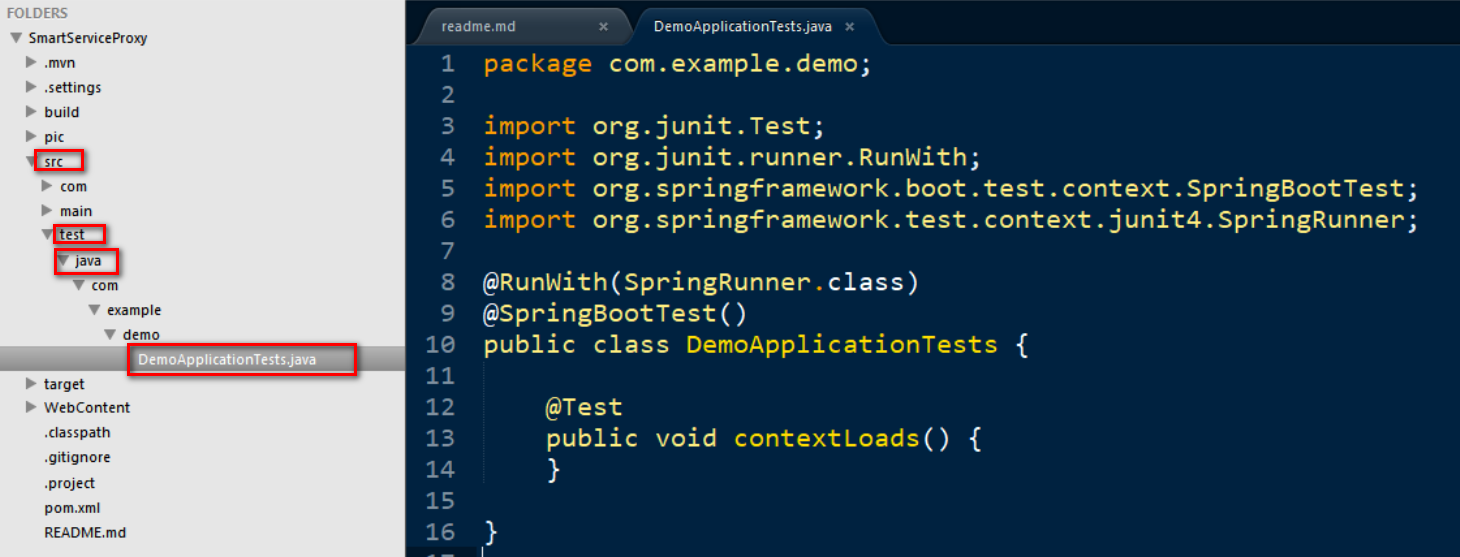 由于我这个SpringBoot项目的入口是com.sap.smartService.SmartServiceApplication, 因此我需要在单元测试启动类里指定这个入口类: