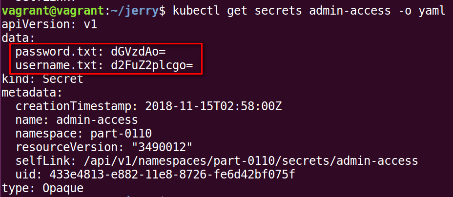 而我们刚刚创建的secret的类型为Opaque,因此在kubectl get secrets的返回结果里,能看到password和username的值均为base64编码: