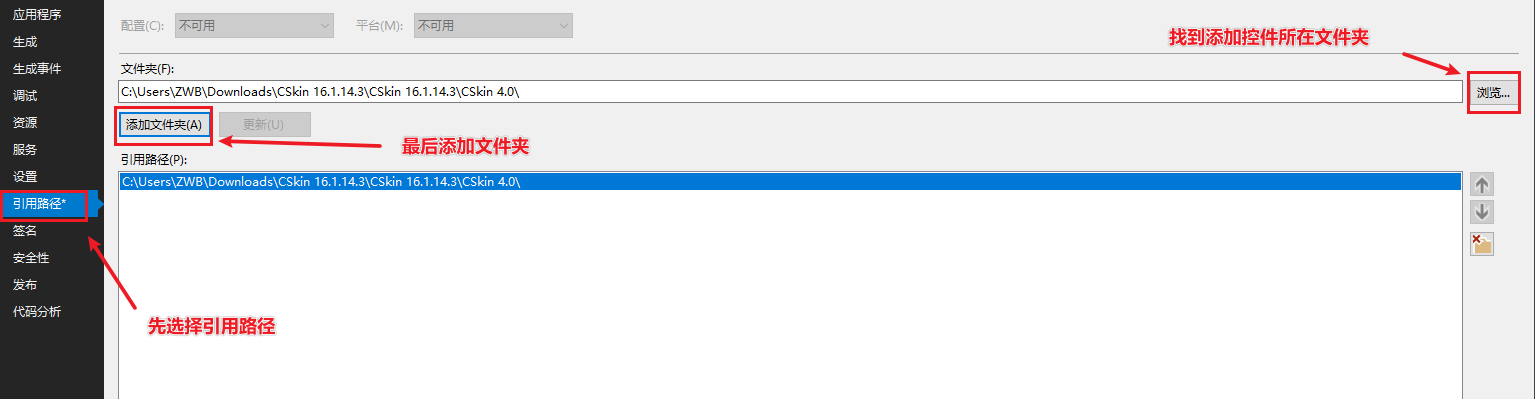 这个时候右键类库,选择属性,选择引用路径,找到添加控件所在的文件夹,最后添加文件夹