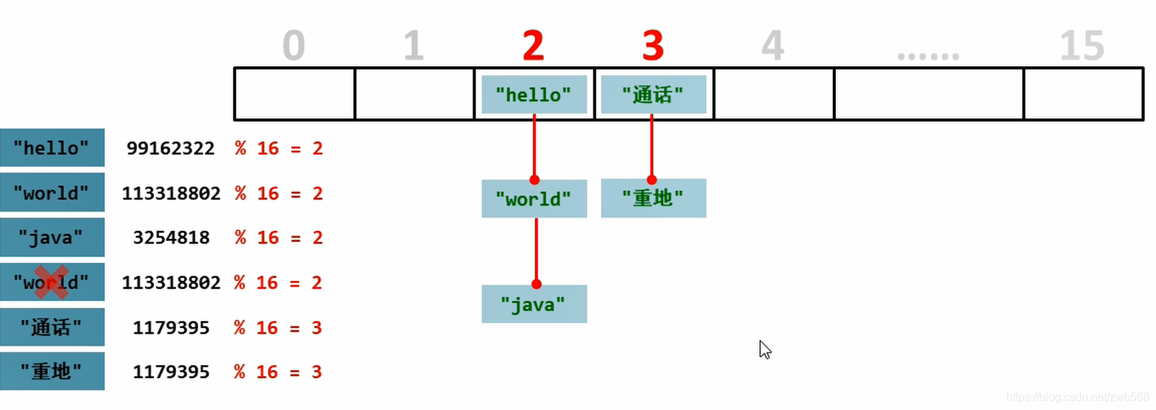 哈希表在存储数据的时候,首先让哈希值对16取余,余数相同比较哈希值,不同就存入相应位置,相同则继续比较数据内容,不同就存入相应位置,相同则不进行存储。