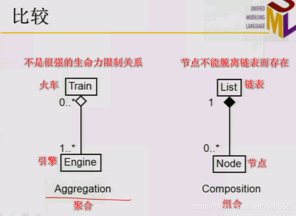 聚合:整体和部分之间是一种松耦合的关系,用空心菱形表示