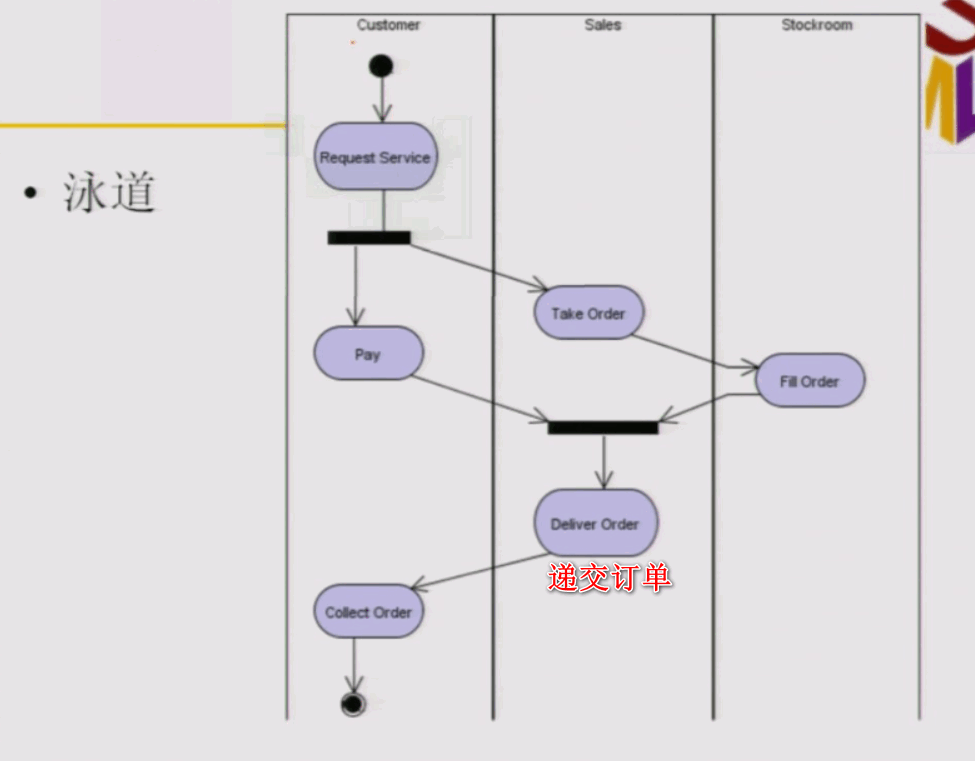 泳道:用于对活动图中的活动进行分组,用于描述对象之间的合作关系
