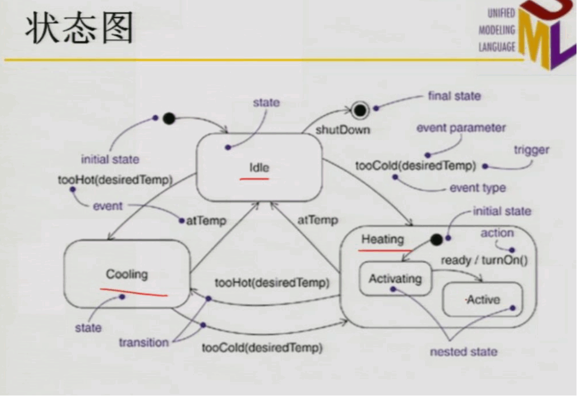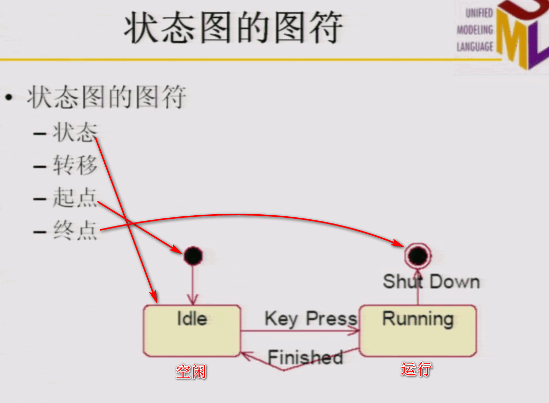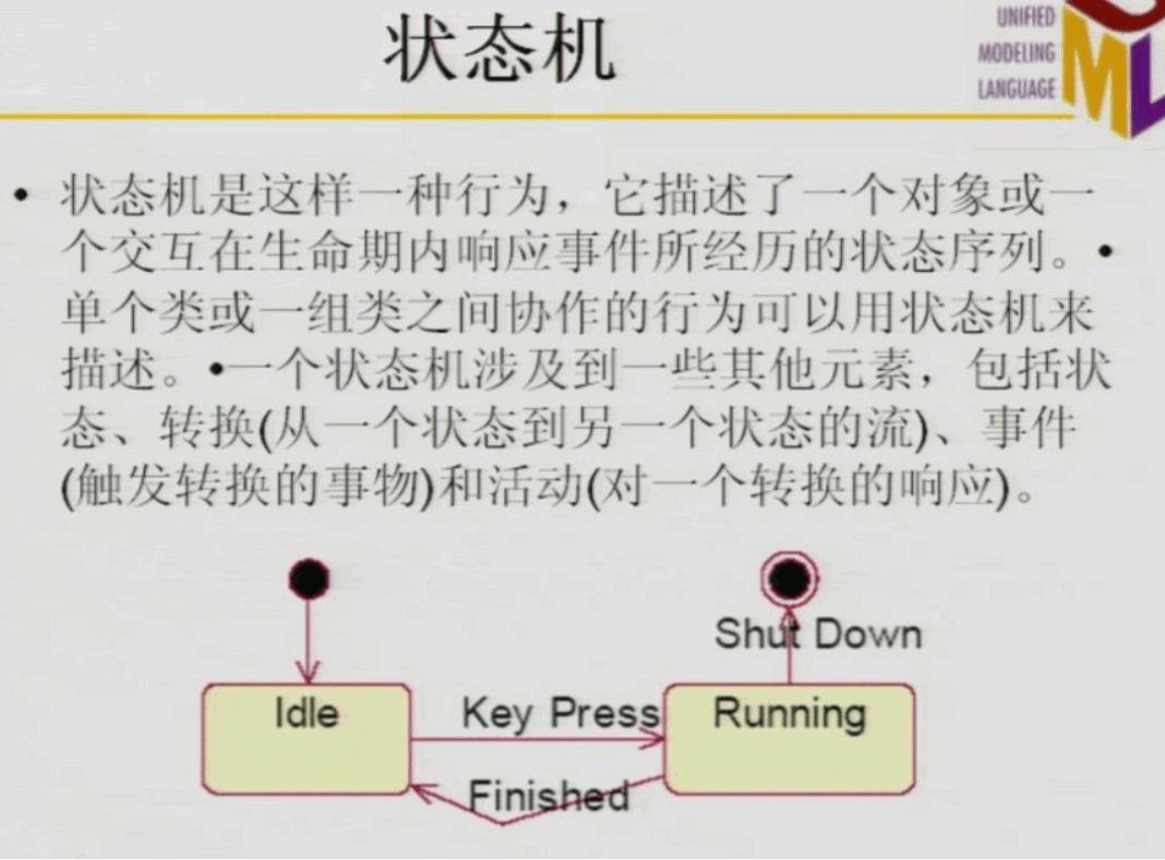 状态图用来描述一个特定对象的所有可能状态以及由于各种事件的发生而引起的状态之间的转移。