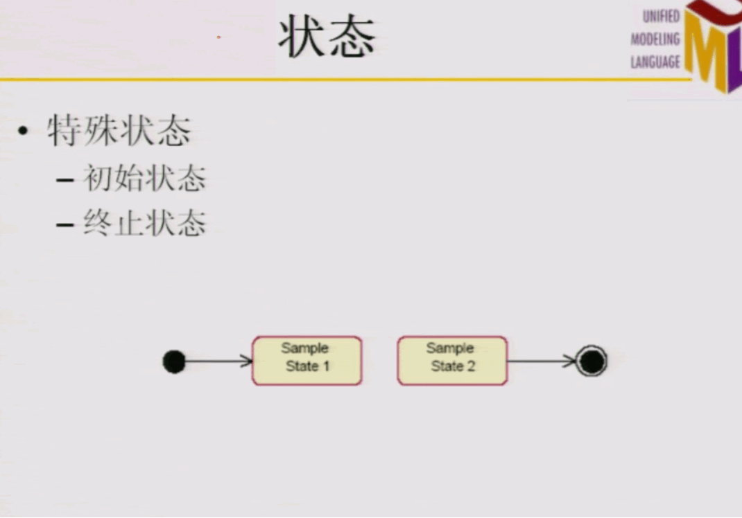2.状态图描述了一个具体对象的可能状态以及他们之间的转换。