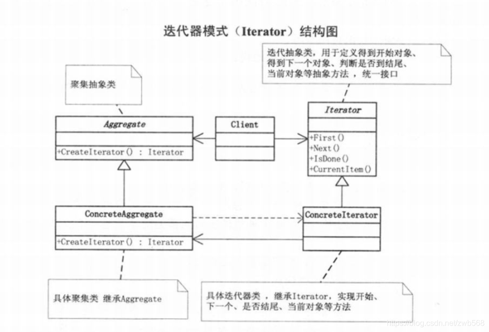 为遍历不同的聚集结构提供如开始、下一个、是否结束、当前哪一项等统一的接口。