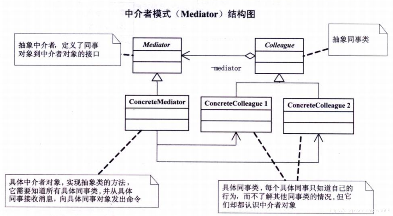 中介者模式(Mediator):用一个中介者来封装一系列的对象交互。中介者使各对象不需要显示的相互引用,从而使其耦合松散,而且可以独立的改变他们之间的交互。