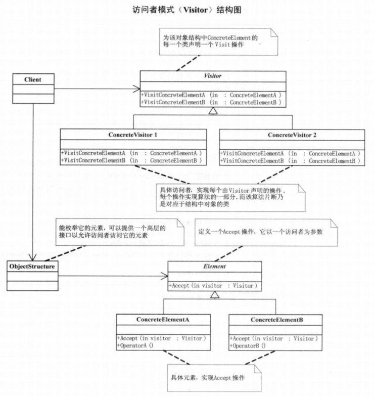 访问者模式(Visitor):表示一个作用某对象中的各元素的操作。他使你可以在不改变各元素的类的前提下定义这些元素的新操作。