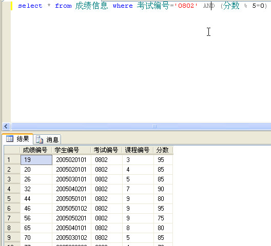 查询考试编号为0802且分数是5的整数倍的信息