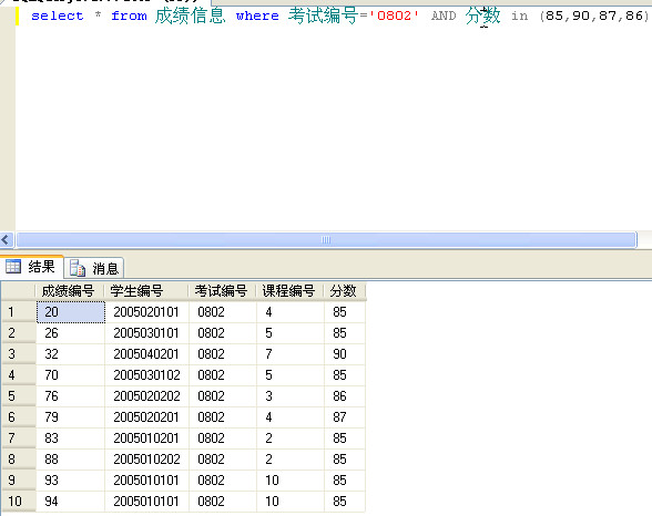 查询考试编号为0802且分数是固定数值:85、90、87、86(也可以在in前加上not,表示排除括号中的数值)