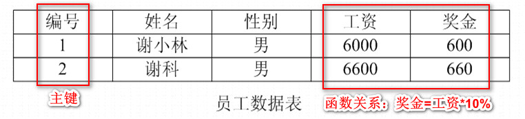 上图中就是不符合第三范式的典例,这样的表造成了数据的冗余。如何让其变成第三范式呢,直接去掉奖金这一列即可。