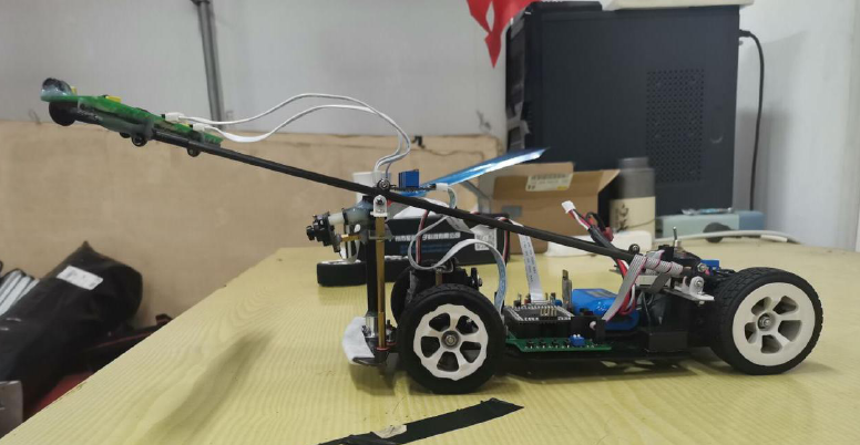 我们把摄像头放在了整个车的车头位置。电池放置在靠近电机的位置,为什么将电池放在这是因为为了让整个车的重心靠近中间,我们将电路板固定在底盘上,整个主控上面包含了所有的模块,节省了空间降低了重心。如图 2-3。
