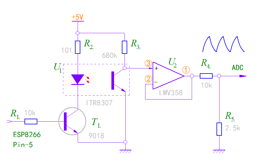 下图给出了测试电路。 其中T1用于驱动ITR8307的发光二极管; U2是将ITR8307的集电极的电压进行阻抗转换,然后又R4,R5分压后送入ESP8266的ADC。