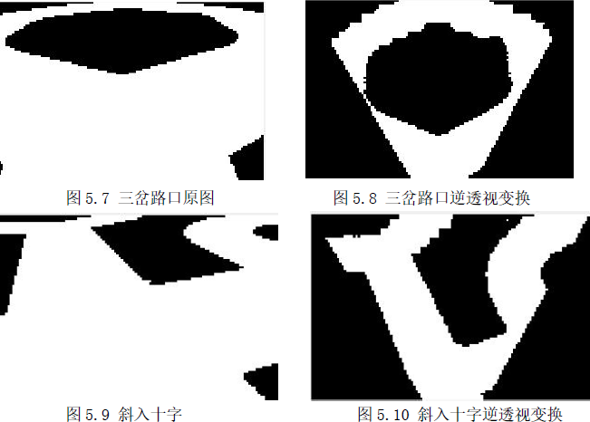 在本届比赛当中,主要赛道类型为圆环、三岔路口、十字路口以及车库,对于智能视觉组而言还会出现 AprilTag码,它对于图像的边界提取有一定的影响,此处也需要进行特殊处理。我们所处理的是灰度图二值化后的图像,并没有对图像进行逆透视变换,没有逆透视变换的图像找某些元素的特征相对来说会比较困难,以三岔路口与斜入十字为例,对比效果如图 5.7~5.10所示。但直接处理原始图像也是有方法可寻的,下面介绍一下我们的大致方案。