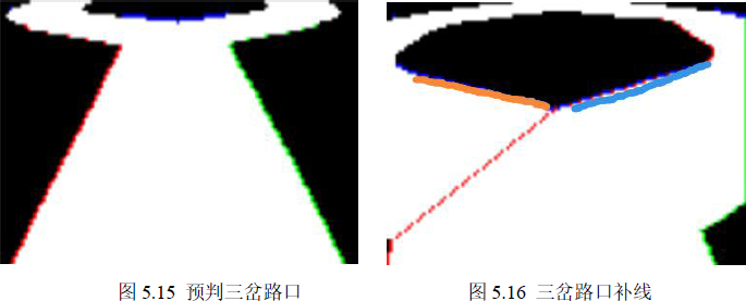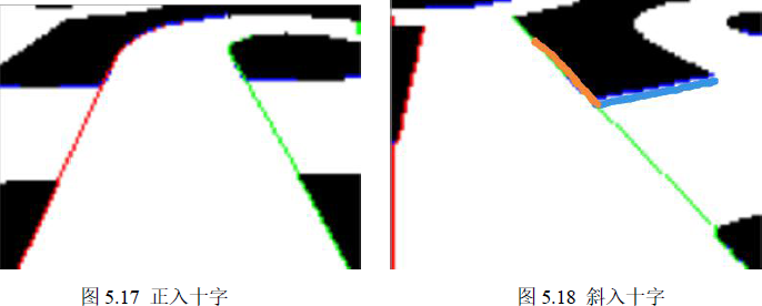 在车模运行速度不高时,十字路口可以选择不进行处理,直接使用各行中点的加权平均即可比较稳定的驶过。但是在高速运行时,可能因为某些情况导致车模转向有点偏离轨道,使得图像中点不稳定,使车模冲出赛道,因此需要对十字路口路段进行补线的操作。正入十字路口时图像特征比较明显,左右边界都存在连续的丢线情况,找到相应的拐点进行连接即可,如图 5.17所示。处理起来相对困难的是斜入十字,此时的图像与三岔路口的边界信息相似度比较高,会出现误判的情况,因此我们需要引起其他条件进行约束,我们采取的是计算顶部边界的外凸的两条边的斜率,如图 5.18所示,根据橙线与蓝线两者的斜率情况可以将三岔路口与斜入十字所区分,三岔路口时这两条线可以参考图