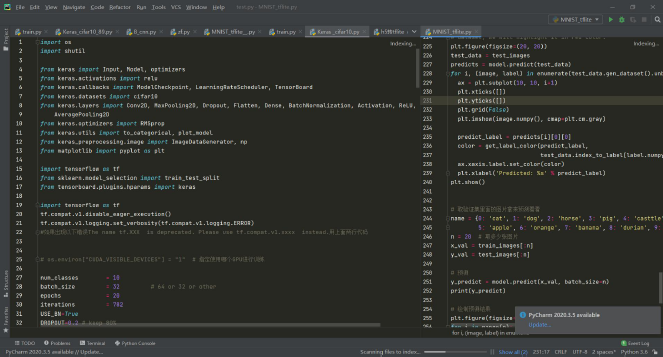 数据集的制作与图像识别模型的开发是在 PyCharm平台上完成的。PyCharm是一种 PythonIDE(Integrated Development Environment,集成开发环境),带有一整套可以帮助用户在使用 Python语言开发时提高其效率的工具,比如调试、语法高亮、项目管理、代码跳转、智能提示、自动完成、单元测试、版本控制。PyCharm是由 JetBrains打造的一款 PythonIDE。同时支持 Google AppEngine,PyCharm支持 IronPython。这些功能在先进代码分析程序的支持下,使 PyCharm成为 Python专业开发人员和刚起步人员使用的有力工具。