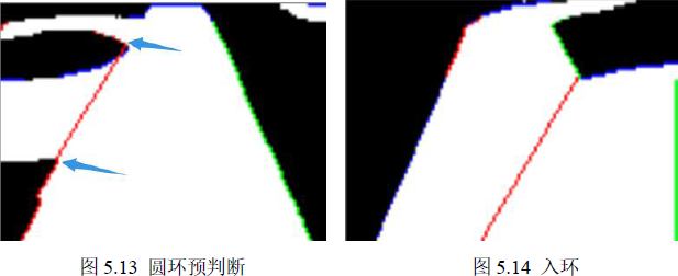 圆环的识别,相对其他元素特征比较明显,几乎不会出现误判的情况。摄像头处理圆环时,其前瞻与电磁传感器相比会长很多,可以提前预判到圆环的出现,当入环偏慢时,速度上可以做相应的决策。对于图像而言,圆环的特征为一侧是长直道,另一侧是一段圆弧。圆弧侧的边界特征便是会先出现一段丢线,随后才是一段圆弧,这个特征在其他元素上几乎是不会出现的,图像处理结果如图 5.13与图 5.14所示。