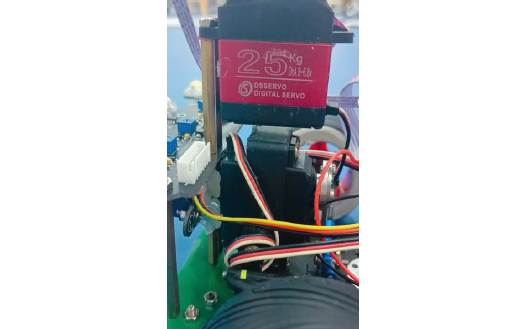 在车模运行时,遇到 AprilTag二维码或者三岔路口的数字标靶需要停车对标靶中的图像进行识别,标靶的位置有三种情况,分别是车模正前方、左侧与右侧。我们只采用一个 OpenARTmini进行图像识别,因此我们安装了一个舵机云台进行 OpenARTmini摄像头的转向。