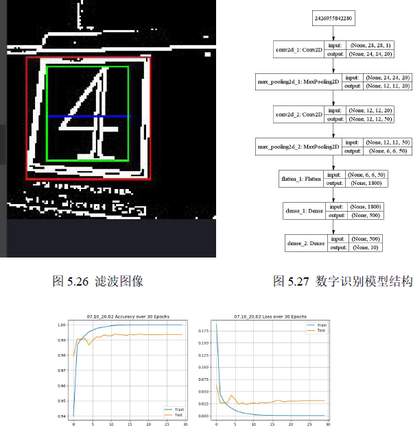我们用的数据集是一个非常有名的手写体数字识别数据集——MNIST。但是MNIST里面的图片是黑白的,于是我们在采集图像的时候使用平均自适应阈值滤波,将图像转为黑白(滤波图像如图 4所示)。将图像转为黑白带来非常多优势。首先二值化之后图像只剩下黑白,在找框时识别速度更快并且不会出现误判。其次图像为黑白模型需要处理的信息变少,模型的大小也相应减小许多(数字识别模型结构如图 5所示),OpenART的识别速度也变快了不少。而且最重要的时用的成熟的模型,模型准确率也有保障。准确率如图 6所示。