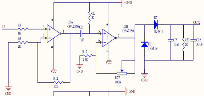 使用 OPA2350作为运算放大器,将电感两端产生变化感应电动势进行两级运放,由原来的几百 uV放大至微处理器 ADC能够识别的电压范围 1-2V,因为放大后的电压还是变化的交流,所以需要对该放大后的电压半波整流和滤波,最终得到一个直流模拟电压信号,并且该电压信号的大小会随着电感与寻迹导线之间的距离减小而增大。