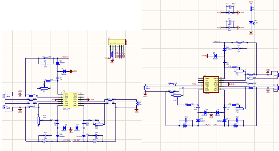 此电路为电磁采集模块与单片机的接口电路。采用1MM 8P FPC接线端子,大大地缩小了电路板面积。