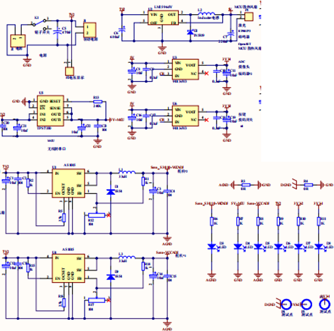 整辆小车都是用2000mAh的镍铬电池提供,但是各种元器件所需的电压不同,这就需要我们用不同的电源芯片来生成不同的电压。