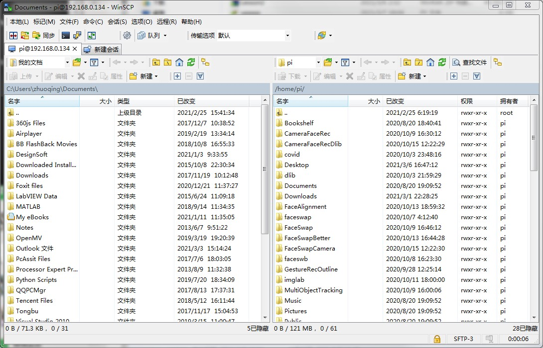 WinSCP会自动连接树莓派FTP,并显示对应的文件结构。