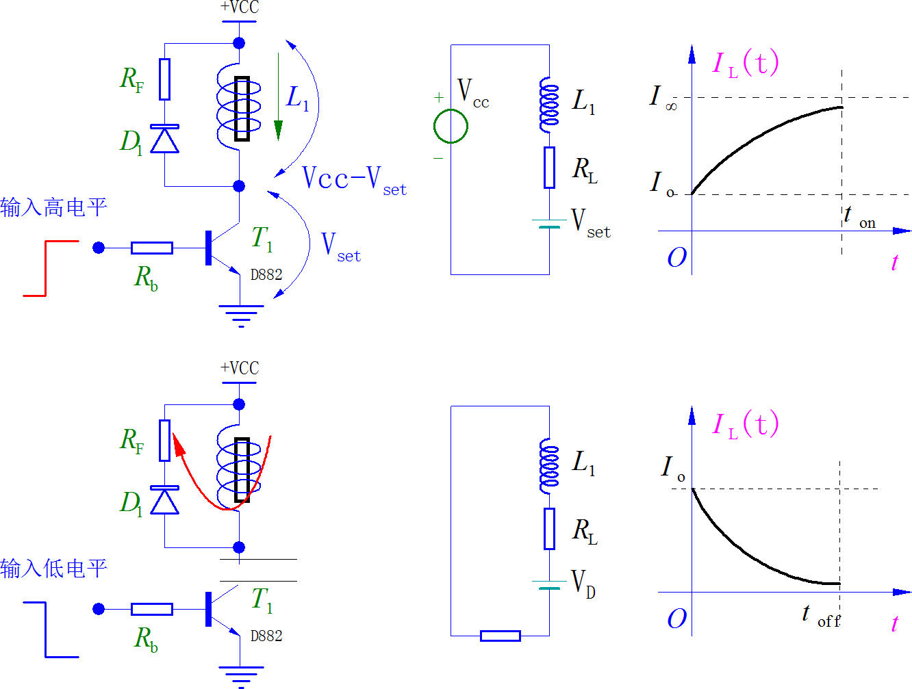 利用假设的简化条件,可以得到电流上升和下降的渐进稳定的电流分别是: I H ∞ = V C C R L , I L ∞ = 0 I_{H\infty } = {{V_{CC} } \over {R_L }},\,\,I_{L\infty } = 0 IH∞=RLVCC,IL∞=0。可以列写出在电流上升阶段和下降阶段的对应的指数函数方程。在晶体管导通器件,电感电流指数上升: