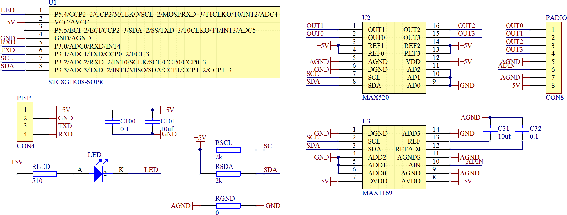 集成有MAX1169,MAX520的DAAC单片STC8G1K08机电路板