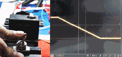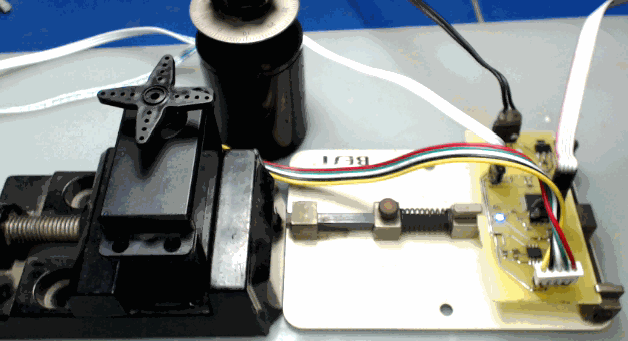 控制舵机中马达两端的电压(正负1V),可以观察到舵机输出轴的转动,同时位置传感器上的电压随着转动角度线性变化。