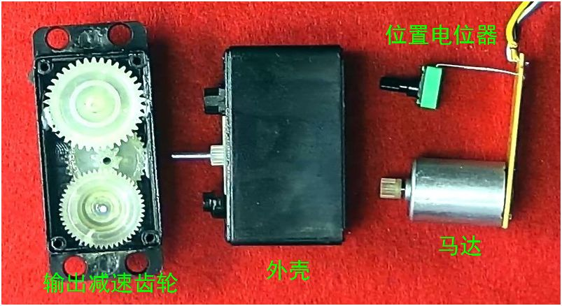 舵机内部马达的输出通过减速齿轮控制舵机的输出轴,同时经过另外过渡齿轮驱动位置电位器。电位器转动有机械极限位置,这也决定了舵机输出转角有机械机械位置。