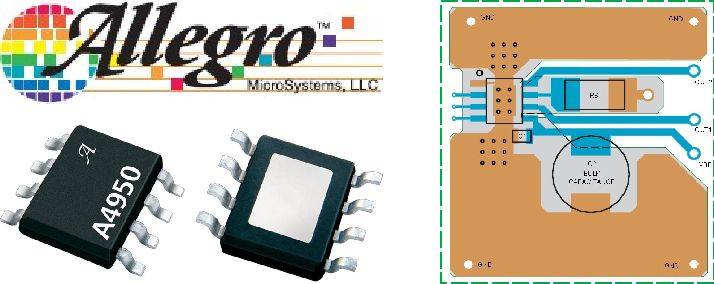 为了达到A4950输出功率范围,在它的数据文件中还给出了PCB的参考设计方案,A4950消耗的功率所产生的热量可以通过芯片底部金属衬底引至电路板上的铜层进行散热,保证了芯片工作的热稳定性。