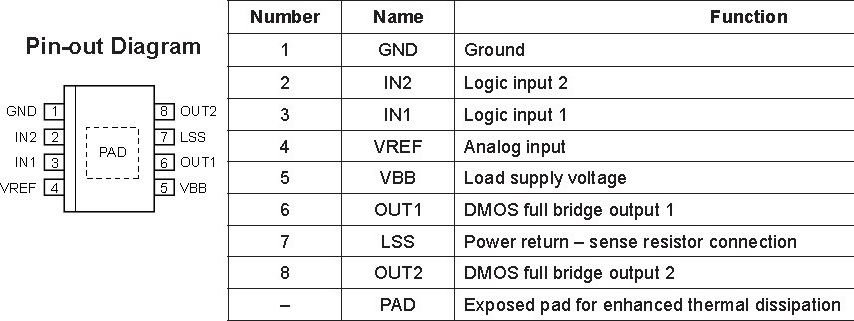 A4950另外一个优点就是提供输出电流保护以及热保护。通过LSS端口的电流采样电阻,可以设置芯片输出的最大电流值。比如在VREF = 5V的情况下, 电流采样电阻Rs=0.25欧姆,最大输出电流就被限制在2A左右。