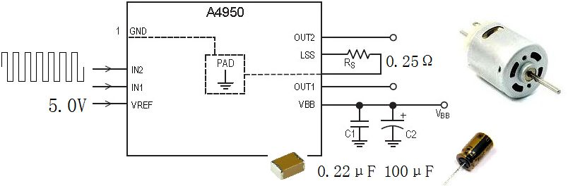A4950可以通过一组互补的PWM波形完成对于电机的正反转控制。数据手册中给出了为了抑制EMC,芯片工作电源上所需要的滤波电容的参数。