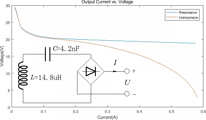 接收线圈串联谐振电容可以有效提高接收电路输出功率。如果电容与接收线圈不匹配,就会造成输出功率的急剧下降。下图实验反映了接收电路在谐振与非谐振两种情况下,输出电流与电压之间的关系。