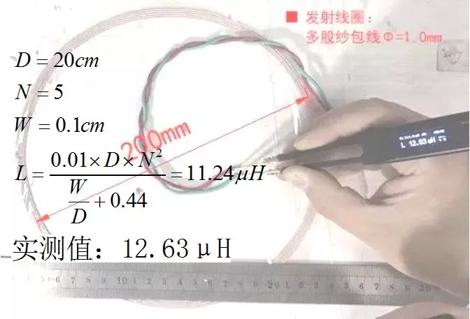根据上述公式,对于实验中的空心接收线圈进行计算。使用中所使用的发送线圈,是将多股纱包线绕制成同一平面上的螺旋线。因此线圈的直径D可以使用线圈的平均直径;线圈的宽度W就是纱包线的直径。代入公式经过计算,发射线圈的电感量应该是11.24uH,实际测量时12.64uH ,它们之间很接近。