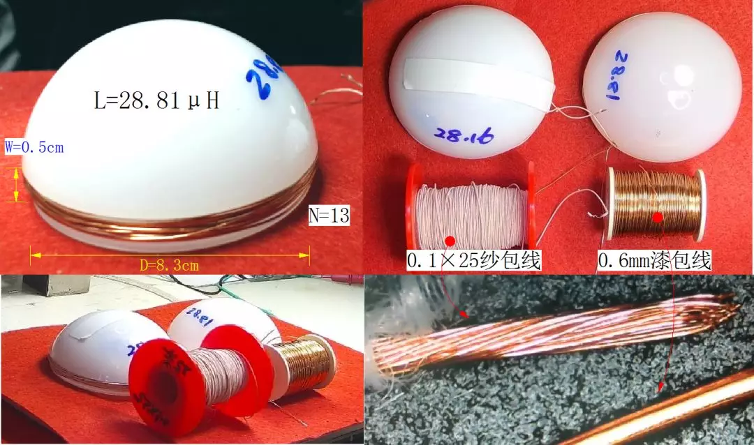 下面可以通过实验来检查它们之间的差别。为了便于比较,使用两种直径接近的导线绕制直径相同的接收线圈。一种使用25股,0.1mm的纱包线,一种使用之间为0.6mm的漆包线分别进行绕制。图中使用了两个相同的信标灯罩来绕制接收线圈。