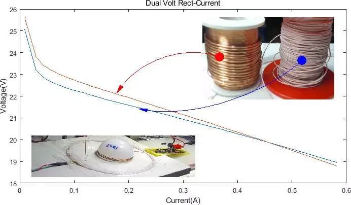 可以看出,两种接收线圈接收电能的效果基本上是一致的,没有明显的差别。只是单股线圈对应的整流输出V-A曲线斜率大一些,对应接收电源的内阻略微大一些。